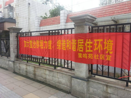 根据市、区文件精神,加大整治群租力度,缔造和谐居住环境,对辖区内“群租房”进行整治。2014年7月8日,鹭鸣苑社区在辖区各小区内悬挂“群租房”整治横幅。对重大安全隐患、严重扰民的房屋开展整治,遏制“群租”蔓延。还居民一个生活安全的居住环境。
