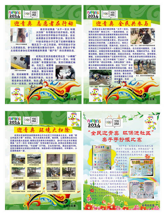 为迎接青奥盛会的到来,近日,虹苑社区制作25幅迎青奥宣传展板,6条横幅,并张贴宣传画,积极营造迎青奥的氛围。