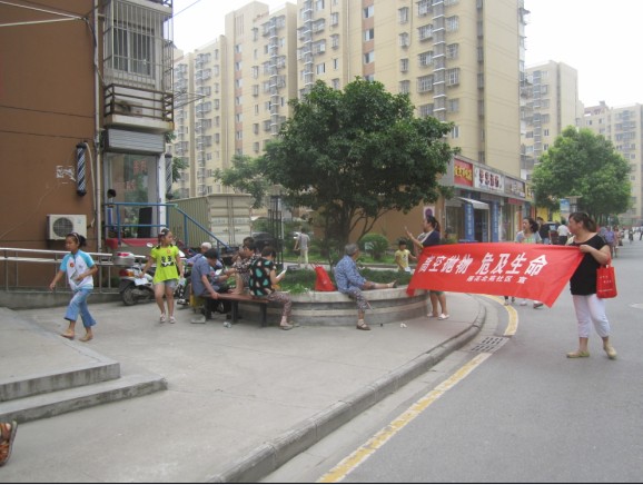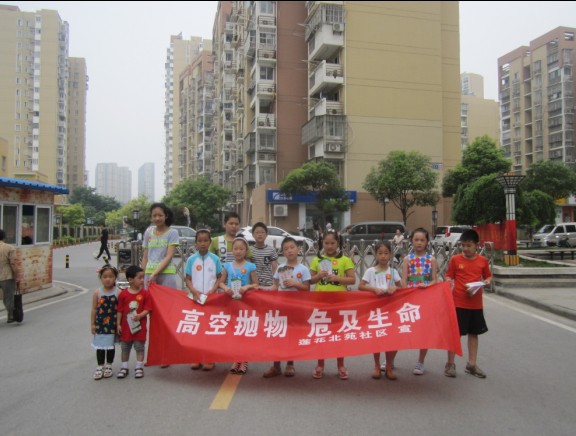 莲花新城北苑是经济适用房小区,楼层高,高空抛物现象多方宣传后仍屡禁不止,居民头疼社区也头疼。2014年7月11日上午,在室内的消防安全知识讲座结束后,莲花北苑社区组织青少年进行“拒绝高空抛物”宣传。旨在通过此次行动,再次加强“高空抛物”方面的知识宣传,让辖区居民意识到高空抛物的危害,自觉遵守行为规范,拒绝高空抛物,共建和谐平安莲花。