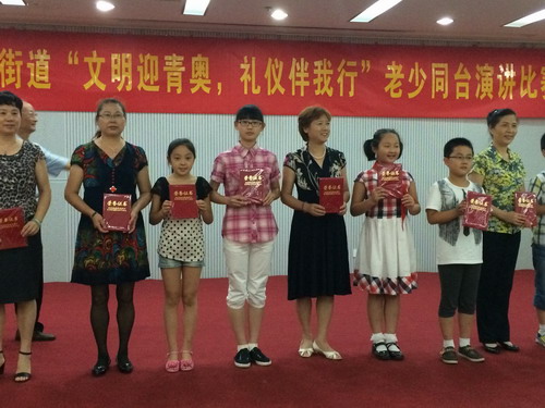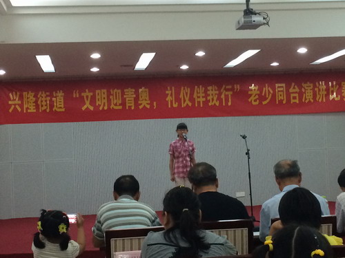 7月17日下午2点我社区李木子同学代表金典社区参加了街道举行的“文明迎青奥、礼仪伴我行”老少同台演讲比赛,李木子同学慷慨激昂的演讲受到了在场各位的热烈的掌声,并取得了第三名的好成绩。