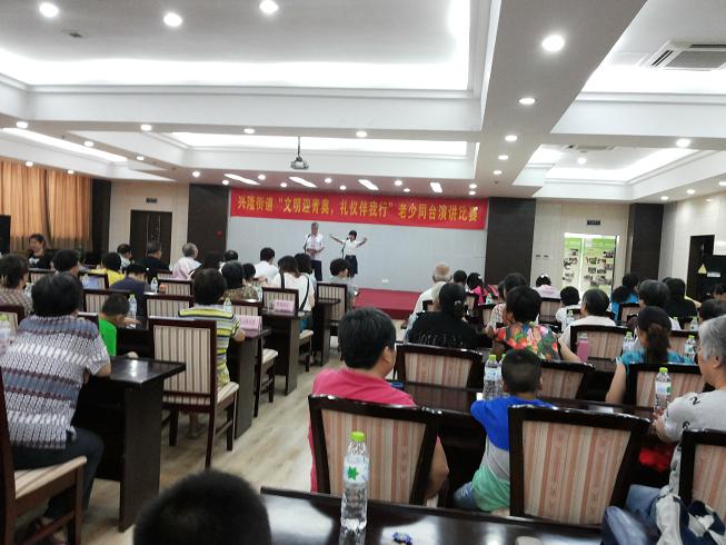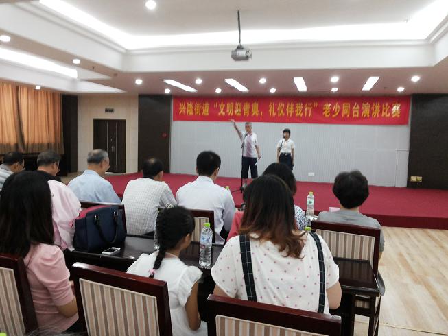 2014年7月17日,兴隆街道四楼会议室内坐无虚席,这里正在举行由街道关工委组织的“文明迎青奥、礼仪伴我行”老少同台演讲比赛。奥体社区居民退休老师江家福和拉萨路小学朱艺晨小朋友代表社区参赛。他们演讲的题目是“情系青奥、礼仪同行”。当江老师说到:“与青奥同行,文明养成从我做起——争做奥林匹克精神的践行者,不懈追求健康文明的生活方式,自觉遵守社会主义核心价值观,在未成年人中开展“八礼四仪”养成教育,争做文明有礼中国人。朱艺晨小朋友说到:与青奥同行,告别陋习从我做起——管好自己的嘴,不说粗话脏话,不随地吐痰;管好自己的手,不乱倒垃圾,不损坏公物,不乱贴滥画 ;管好自己的腿 ,不乱穿马路 、不踩踏草坪;管好自己的门,搞好门“三包”,保持环境卫生”时全场掌声雷动。