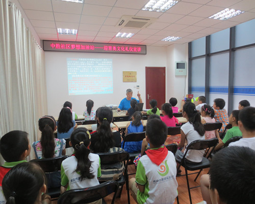 7月16日,中胜社区梦想加油站组织中小学生们开展迎青奥文明礼仪宣讲。参加此次此次宣讲我们邀请的依然是建邺区关工委五老讲师团的江家福老师。老师对南京的人文历史、青奥会的三大场馆和比赛项目等一一做了介绍,学生们都听得津津有味,不时还有学生举手提问,老师也都进行了认真解答。随着老师向学生们输入的内容越来越多,讲课也接近了尾声,但学生们却还希望期待着老师能在多讲一点。