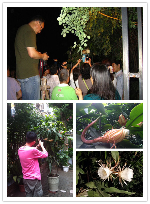 昙花,为仙人掌科,昙花属附生植物,是灌木状主茎圆筒形,喜温暖湿润和半阴环境,夏秋季晚间开大型白色花,花漏斗状,有芳香,冬季温度不低于 5℃ 。盆栽适于点缀客室、阳台和接待厅, 有清热止咳、防治肺痨哮喘等功效。 2014年7月1日 ,社区张老师家的昙花在晚上8:30绽放,社区组织居民观看,居民们争相拍照,希望能留住这短暂的美丽,淡淡的昙花香味萦绕在这一片院落中,意犹未尽。因数量有限,张师傅给部分居民绽放后的昙花留做纪念。此次活动增加了社区与居民、居民与居民之间的联系。