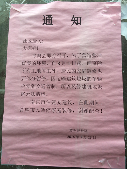 为了青奥盛会的圆满举办,营造整洁优美的城市环境。鹭鸣苑在辖区各小区张贴了通知,自8月1日起,南京除所有工地停工外,居民的家庭装修也要部分暂停。因运输建筑垃圾的车辆会受到交通管制,所以装修建筑垃圾将无法清运。南京市住建委建议,在此期间,希望市民暂停家庭装修。