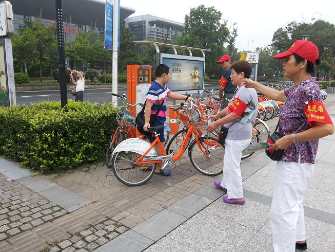 青奥会的脚步越来越近,奥体社区的志愿者也越来越忙。青奥会的主场馆奥体中心位于奥体社区辖区内,重点地铁口及公交站台26个,社区招募志愿者106人,志愿者主要来自本社区的退休居民,暑期大学生及高中生,他们用行动表达了对青奥的支持,对青奥的期待。其中所有志愿者的参与都离不开家人的支持,母亲支持在校的儿子,儿子支持退休在家的母亲。志愿者任师傅说自己的儿子与儿媳主动承担家务,让她安心到社区做志愿服务。志愿者孟师傅的儿媳刚刚怀孕,但因为婆婆想来社区做志愿者,媳妇自己要求回娘家小住。“迎青奥盛会,做文明人”。奥体社区志愿者用行动践行自己的承诺。奥体中心西便门是地铁10线的出口,人流量较大,好多外地游客想去看青奥村,南京眼。高师傅为了搞清楚这两个地方,特意利用休息时间去实地查看,以方便指导路人。奥体西便门同时也公共自行车存放点,这里常有因人多,车多公共自行车没有存放位,执勤的志愿者自带公共车租赁卡帮助急需存车的居民,然后再打电话给公共自行车管理处告之以便他们及时来调度人员。遇到外的游客,志愿者又成导游,告诉他们公交线、地铁线的旅游路线方便他们省时省力。“为青奥尽一份力,让自已有一段美好回忆”这是我们志愿者共同的心声。