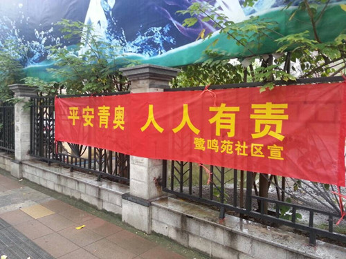 日上午,鹭鸣苑社区在辖区各个小区悬挂平安青奥的横幅,为青奥会营造安全、文明、和谐的氛围。