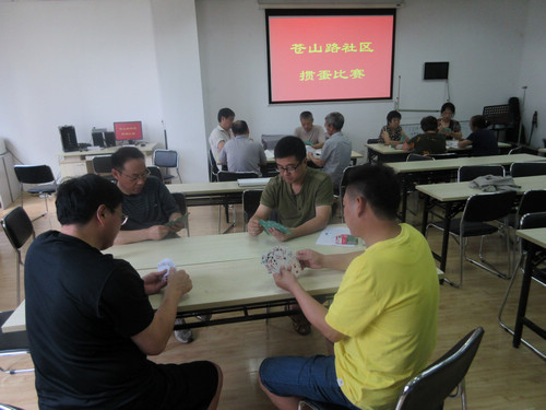 2014年8月3日上午,苍山路社区“邻里一家亲”掼蛋比赛在社区举行,活动现场气氛热烈而不失紧张,体现了“重在参与”的奥运精神。
