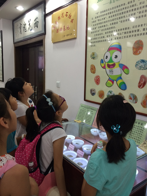 7月31日上午中城社区组织小朋友到吉庆家园社区参观“花儿朵朵心向党,百名少年迎青奥”雨花石主题展。以迎青奥为主题,利用100枚雨花石石上的梅花图案,100组雨花石配成的青少年,100枚含苞待放的花朵,100枚南京风光名胜,用这些天然形成、五彩缤纷的石头,举办“花儿朵朵心向党,百名少年迎青奥”雨花石主题展让小朋友们流连忘返。谢爷爷和张爷爷也为小朋友们讲了许多关于雨花石动人的故事。雨花石的形成,砳砳的来历等都让同学们对南京雨花石有了更深一层的理解。