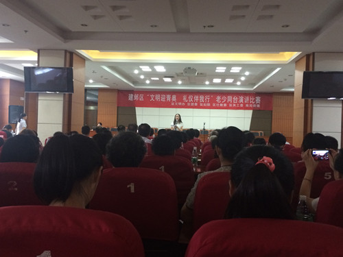 2014年8月8日上午,鹭鸣苑社区带领辖区小朋友参加了建邺区“文明迎青奥 礼仪伴我行”老少同台演讲比赛。来自各个街道的“五老”、学生、社区工作者、社区居民共计百余人观看了比赛。选手们在前期的充分准备下,抑扬顿挫,深情并茂的演讲,博得了观众们阵阵掌声。