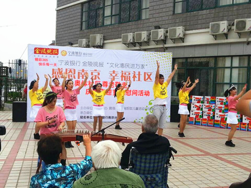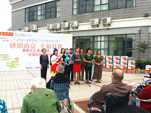 金秋时节,硕果累累;金秋时节,丹桂飘香。在新中国成立六十五周年和九九重阳佳节来临之际,南京市漳州商会党支部、江苏省妇女儿童活动中心奥体分部党小组成员、兴隆街道奥体社区的居民朋友们来到社区共建单位万福园敬老院,用他们的歌声和舞蹈为老人们送上精彩的文艺表演,同时奥体社区党委和南京市漳州商会党支部为老人们准备实用的慰问品,叮嘱他们要注意保重身体,送去社区的一份关爱,送去党的一份关怀。