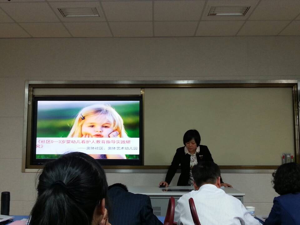 2014年10月28日,奥体社区参加建邺区“学校社区结对共建、双向服务”社区教育实验项目结题汇报会。会上,奥体社区副主任汤英霞对奥体社区与奥体艺术幼儿园共建的“社区0-3岁婴幼儿看护人教育指导实践研究”实验项目进行了汇报。汇报内容分:项目实验背景、项目实验过程、项目实验成效等几个方面。