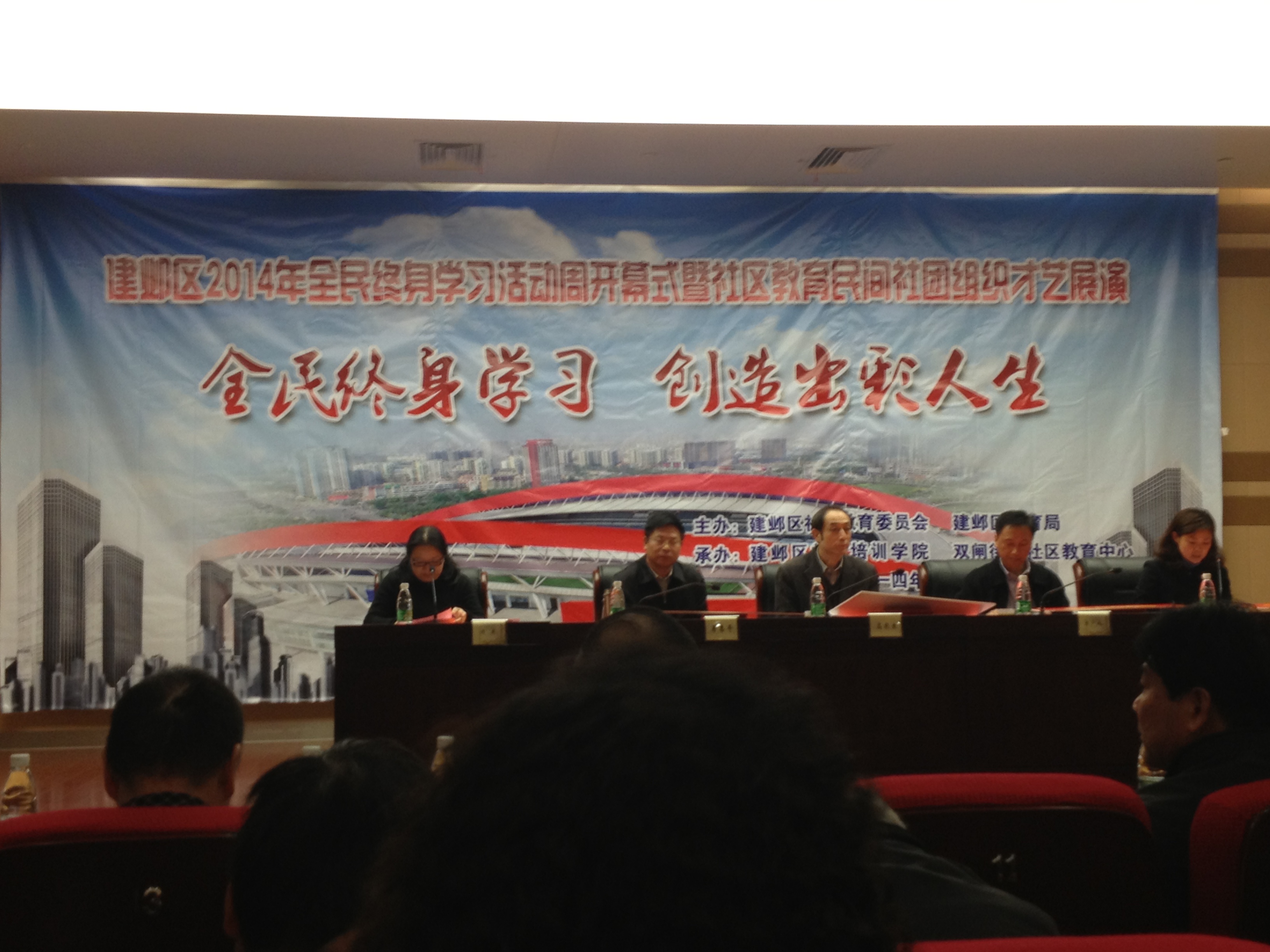 11月18日,莫愁湖街道北圩路社区教育专干张旸参加了在双闸街道小礼堂举办的题为“全民终身学习、创造出彩人生”的“建邺区2014年全民终身学习活动周开幕式暨社区教育民间社团组织才艺展演”。