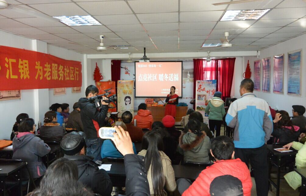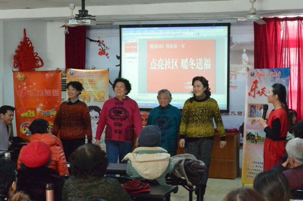 2014年12月29日下午,水西门社区联合云媒体江苏老年电视,共同举办“精彩365、快乐每一天”之“点亮社区、暖冬送祝福”活动。活动一开始,云媒体电视的主持人首先开始介绍老年电视的“961”频道;接下来,社区老年居民朋友们一起载歌载舞、时装走秀;最后,在社区杨主任的带领下,社区老年居民们一起为全省的电视观众送上新年祝福。整场活动气氛非常热烈,居民朋友们参与度也非常高。