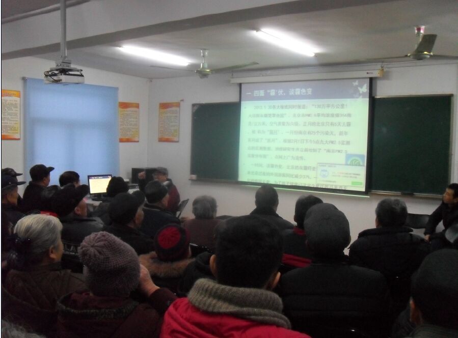主讲老师是江苏省学科(环保)传播首席专家、江苏省环境科学研究院教授李耀东先生。李教授用通俗易懂的语言,结合幻灯片,给社区居民讲述了什么是“雾霾”、“雾霾”产生的原因、危害以及如何做好自身的防护以减轻雾霾天气对人体的伤害。并告诉大家在“雾霾”天气里,要尽量减少外出和户外运动,若外出要戴正规合格的口罩,选与脸型大小匹配的型号,最大程度贴紧皮肤,回家进门要先洗脸、漱口、清理鼻腔,最关键的是清理鼻腔,注意一定要轻轻吸水避免呛咳。在家中要关闭门窗,并注意饮食,少食用辛辣等刺激性食物,避免诱发呼吸系统疾病。讲座中大家还就自已感兴趣的问题举手提问,李教授一一给予详细回答,现场互动十分热烈。