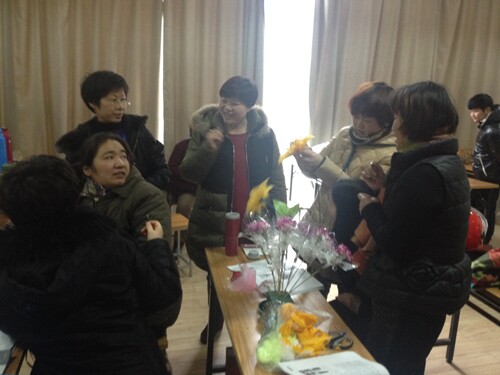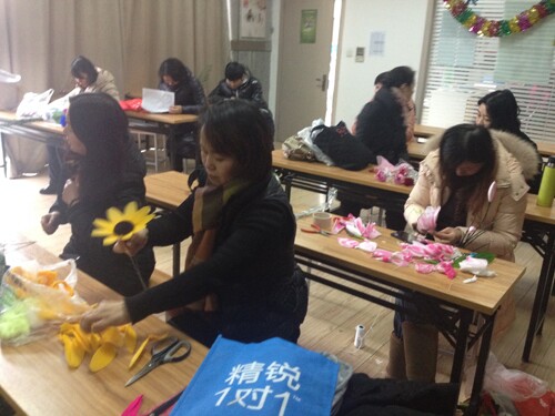 1月28日,老师教学员们制作手工丝网花。今天主要教了向日葵花的制作方法和注意事项。学员们对丝网花的制作兴趣颇深,都认真的练习着丝网花的制作。