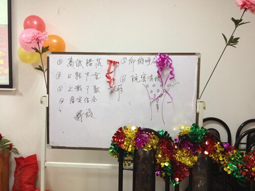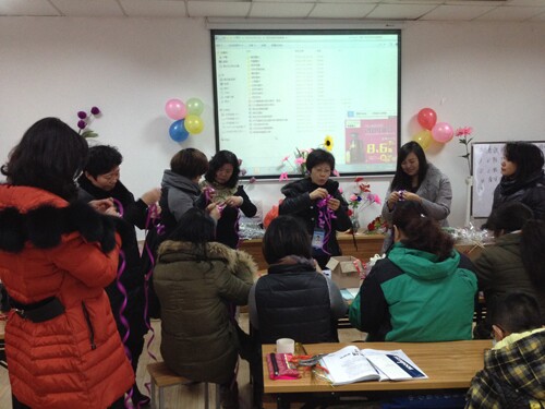 1月29日,老师教学员们制作手捧花包装花球和学习花篮的包装方法。老师用彩带制作出一个花球,一边制作一边让学员跟着练习,又教学员们如何包装花篮,细心讲解,手把手的教学员们。