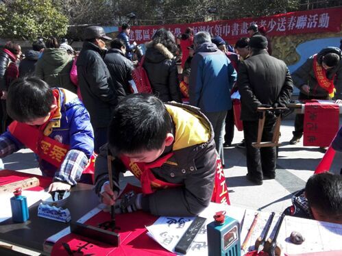 活动现场有三四十位老少书法爱好者撰写春联和横幅,我社区的书法爱好者崔艺萱为大家泼墨送福,活动场面十分热闹,临近的居民路过还驻足求对联贴门上。活动非常成功,表达了辖区居民对新春的祝福和期望。