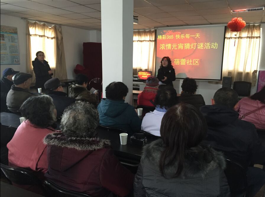 元宵节猜灯谜是一种古老的汉族民间的传统习俗,每逢佳节居民朋友们都很踊跃的参与这项活动。2015年3月6日上午,由蓓蕾社区主任刘佩茹主持这项文体活动。蓓蕾社区主任刘佩茹把谜语写在纸条上,然后发给居民们来猜,居民朋友纷纷跃跃欲试,因为谜语能启迪智慧又能激发大家的兴趣,所以很受居民的欢迎。猜灯谜添加了节日的气氛,同时也展现了人们的才智和生活向往。