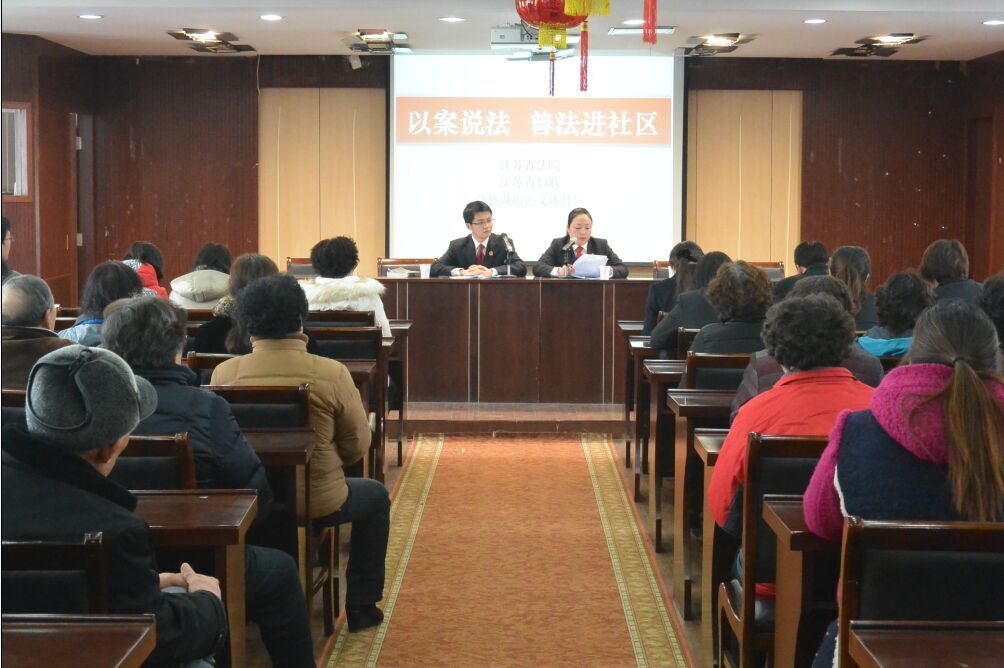为进一步增强社区居民的法制观念,加强居民学法、知法、守法意识, 3月11日下午文体社区邀请了江苏省妇联及省高院的检察官们,在南湖医院三楼为社区居民们开展“以案说法,普法进社区”活动,检察官们通俗易懂的案例分析讲解,受到了居民们的喜爱,现场掌声不断。