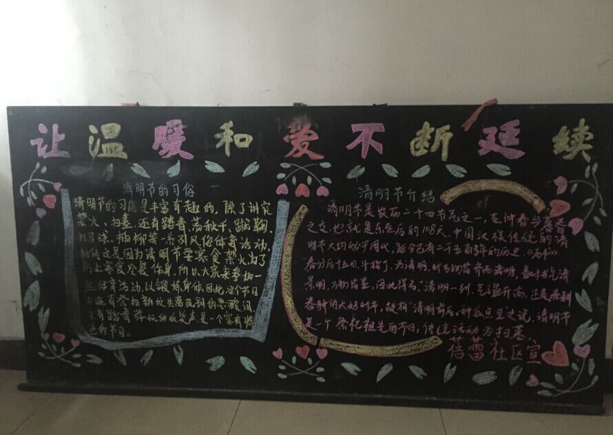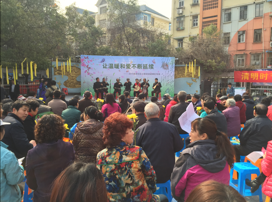 清明节是农历二十四节气之一,也是一个祭祀祖先的节日。2015年3月22日上午在南湖广场莫愁湖街道举办了“让温暖和爱不断延续”的文明祭扫活动。蓓蕾社区承办了此次活动,以挂横幅、出黑板报、挂黄丝带等形式,向居民倡导文明祭祀的方式。活动现场,居民也通过唱歌、朗诵、越剧、挂上祈福卡片等方式来表达他们对故人的哀思。最后,每个参与活动的居民都上台献上菊花,表达他们内心的温暖和温情。用这些方式来代替以往的放鞭炮,烧纸钱的祭祀形式,也倡导节能环保,低碳生活来保护我们赖以生存的环境。