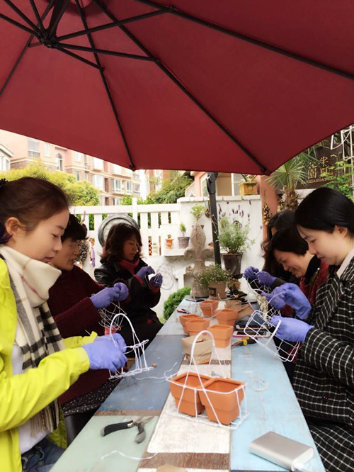 2015年4月13日下午,乐山路社区组织辖区居民到半夏工作室开展手工制作花篮活动。邀请半夏老师教导居民制作简易花篮,在喜多肉植物的潮流下,如何美丽的摆放及没地方放也是一个问题,那么自己做一个可以盛放多肉植物的花篮无疑是一件让人感到开心的事情。半夏老师为了大家方便事先准备了白色的包皮铁丝,两两缠绕、固定,然后就变成了好看的花篮,放上自己喜欢的多肉盆栽,时尚又实用。