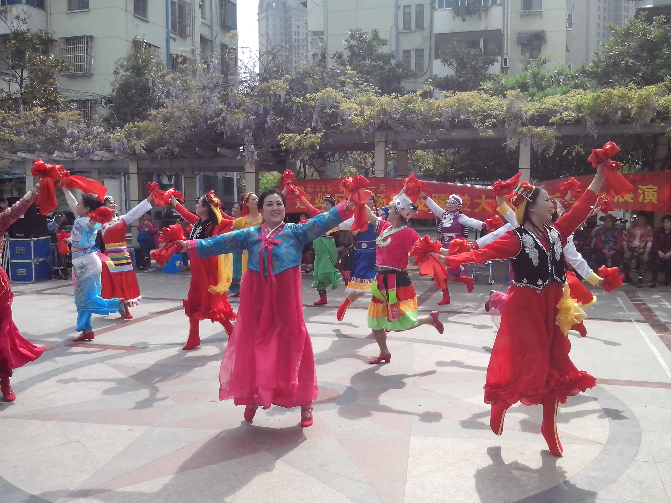 4月24日下午,凤栖苑社区爱好舞蹈的艺术团成员们在精心排练1个月后,代表社区参加广场舞腰鼓比赛。腰鼓舞属集体舞蹈,用于欢庆、热烈的场面,表达人们欢欣鼓舞的心情和劳动人民的英雄气概。他们身穿彩服,腰间挂一只椭圆形小鼓,双手各持一根鼓槌,鼓槌上扎有红绸,边打边舞,鼓点变化丰富,节奏强烈,舞步多变化,他们在表演时情绪热烈,动作健壮,队列整齐,气势浩大,走出了各种复杂美妙的图案。