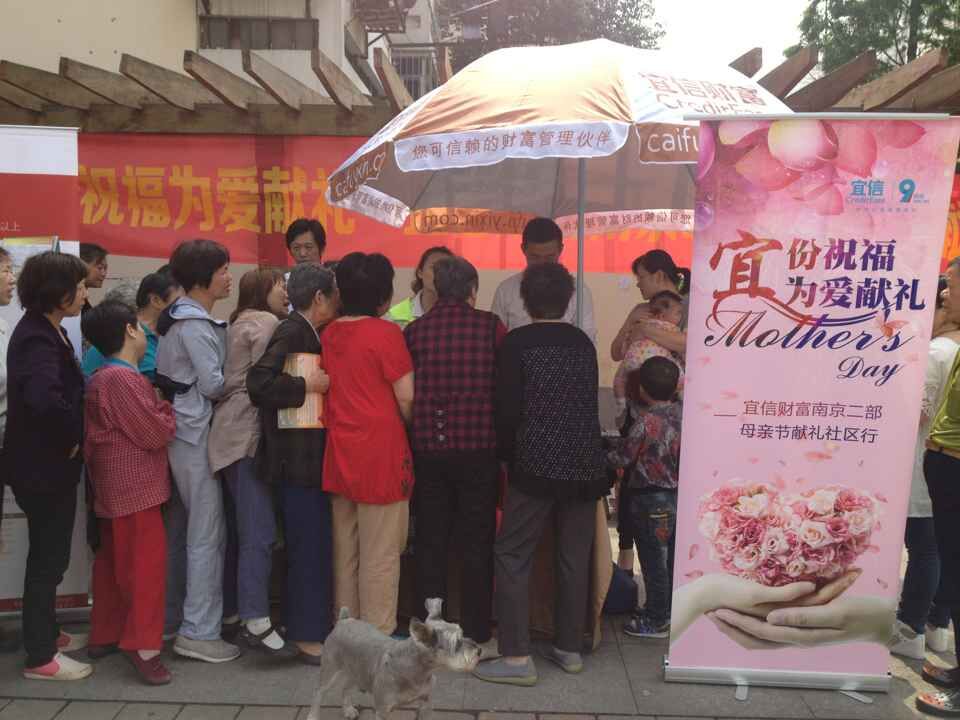 5月10日上午,在“母亲节”到来之际,莫愁湖街道北圩路社区组织辖区居民参与了由宜信财富南京二部和莫愁为老服务中心共同举办的“宜份祝福,为爱献礼”母亲节献礼社区行活动。
