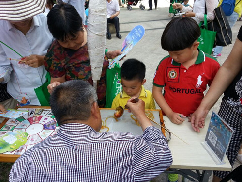 2015年5月31日,中奥社区在辖区内开展“中奥社区庆六一广场文化活动”。本次活动,中奥社区邀请了老民间艺术协会中捏面人和糖画的两位会员,还和物业一起组织了套圈、由小鲜肉组团的乐队表演。活动一开始,做糖画的老师傅桌前就挤满了争先恐后的小朋友,纷纷叫着“我要蝴蝶”“我要小马”好不热闹。糖画艺人手拿勺子,舀起一勺热乎乎的粘稠糖稀,飞快地将勺中的糖稀洒在光洁的大理石板上。一个长柄的铜勺就是“画笔”,一勺糖水经过糖画艺人的舞弄,十来秒钟就能变成一只蜻蜓、一只蝴蝶等,小朋友们拿着心爱的糖画仔细打量着这些精美的艺术品,久久不肯放到嘴中。另一边的捏面人的场面也十分火爆,捏面人的师傅像变魔术一样,变出了各种具有现代感的面人,有萌萌的大白、愤怒的小鸟,笨笨的猪头。