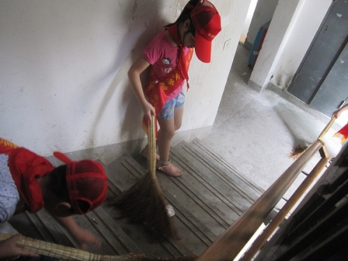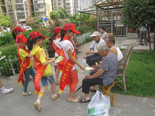 2015年7月15日上午,莲花北苑社区组织辖区青少年开展红领巾楼栋长活动。14名青少年、4名家长、3名“五老”成员及2名青年志愿者参加。活动开始前小朋友们纷纷佩戴好红领巾、“爱学习、爱劳动、爱社区”的绶带和平安志愿者的宣传帽。一名儿童扛着社区暑期活动的队旗带头前行,身后小朋友们紧跟着并整齐出发。她们在关工委工作人员的带领和指导下,走进小区,向居民们发放安全宣传折页,进行安全防范宣传;沿路帮忙摆好自行车、电动车,做好车辆管理;走进小区楼栋,清扫楼道卫生等。活动持续近一个小时,虽然天气炎热,但兴奋的他们不顾脸颊与额头上的汗水,体验着为小区做点实事的成就感,感受着劳动人民的不容易。