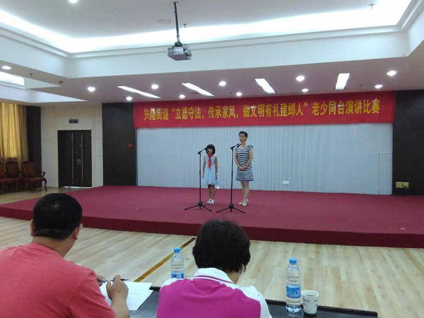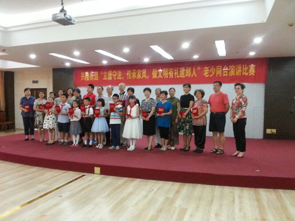2015年7月21日,桃园居社区五老志愿者携小朋友参加在街道四楼举办的老少同台演讲比赛,荣获一等奖。她们的“六讲”:讲道德,树明礼向善之风;讲学习,树艰苦奋斗之风;讲健康,树崇文尚洁之风;讲诚信,树诚实守信之风;讲秩序,树礼让和谐之风;讲奉献,树互助友爱之风,得到了大家的一致肯定。