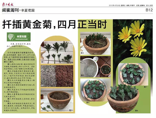 乐山路社区美丽院落成员半夏老师在这个周末教大家《扦插黄金菊,四月正当时》,在扬子晚报B12版刊登。四月份是植物扦插繁殖的好时机,四月的温度一般在15℃-25℃之间徘徊,这个温度特别适合植物的扦插生根。黄金菊,全株具香气带有草香和苹果香,夏季开花。