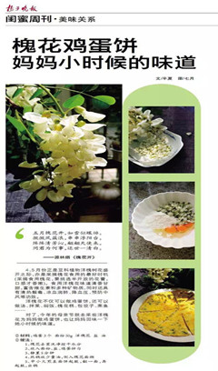 乐山路社区美丽院落成员半夏老师在这个周末教大家《槐花鸡蛋饼 妈妈小时候的味道》,在扬子晚报闺蜜周刊-美味关系版刊登。洋槐花味道清香甘甜,富含维生素和多种矿物质,同时还具有清热解毒、凉血润肺、降血压、预防中风等功效,在母亲节到来之际,可以采些洋槐花为妈妈做鸡蛋饼,也让妈妈回味一下小时候的味道。