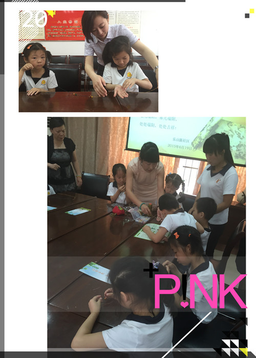 2015年6月19日 上午,乐山路社区组织辖区小朋友做长命缕,事先由高老师准备好五色彩绳,和好看的彩珠等工具。在开始之前向小朋友介绍端午的由来和传统文化习俗,介绍今天的活动内容:制作香囊、长命缕,由社区工作人员及老师协助共同完成,高老师选择了最简单的长命缕制作方式,方便小朋友独立完成,每个小朋友都佩戴了一个,很开心。