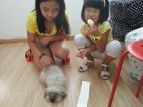 2015年8月12日,桃园居社区迎来了一名新成员——安哥拉垂耳兔小灰。它是社区热心居民专程带来陪小朋友一起玩耍的。小朋友们闻讯都来到社区的居家养老中心陪小兔子一起玩耍。他们有的给小兔子喂水,有的给小兔子喂食,还有的给小兔子打扫卫生整理兔毛。都忙的不亦乐乎。夕阳西下,小兔子要回家了,小朋友都对它依依不舍,希望明天还能过来陪小兔子一起玩耍。