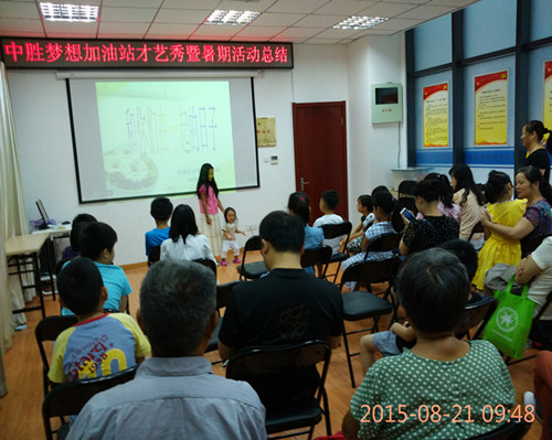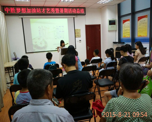 8月21日上午,中胜社区梦想加油站召开了少儿才艺秀暨暑期活动总结。首先是由中胜社区关工委主任为大家致辞。接下来,大家一起欣赏了孩子们带来的精彩表演。朗诵、唱歌、竹笛独奏等丰富多彩。再是由关工委秘书长向大家做了暑期活动总结汇报。最后,社区关工委还给参加活动的同学赠送了文具等奖品,并且对表现优秀的同学进行了表彰,活动在大家的欢声笑语中结束。