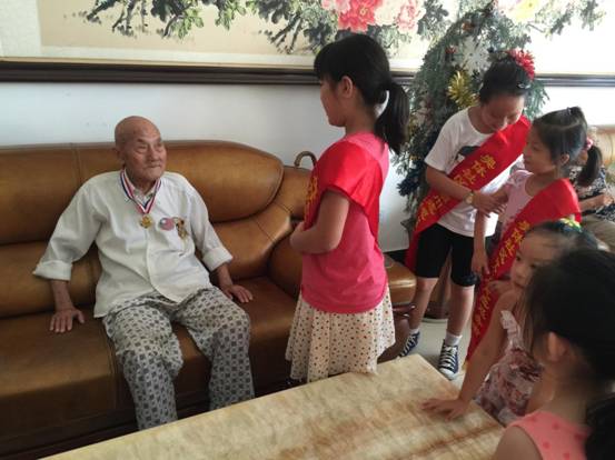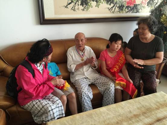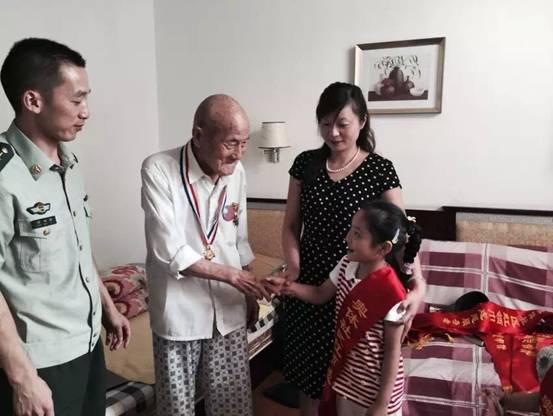 岁的老爷爷胸前挂满勋章,见证着辉煌的历史。老爷爷给大家讲着抗战故事,红领巾志愿者们给老爷爷带来诗朗诵和歌唱,五老们陪老兵聊天。老爷爷表示非常开心,最后还跟大家一起唱起了红歌。